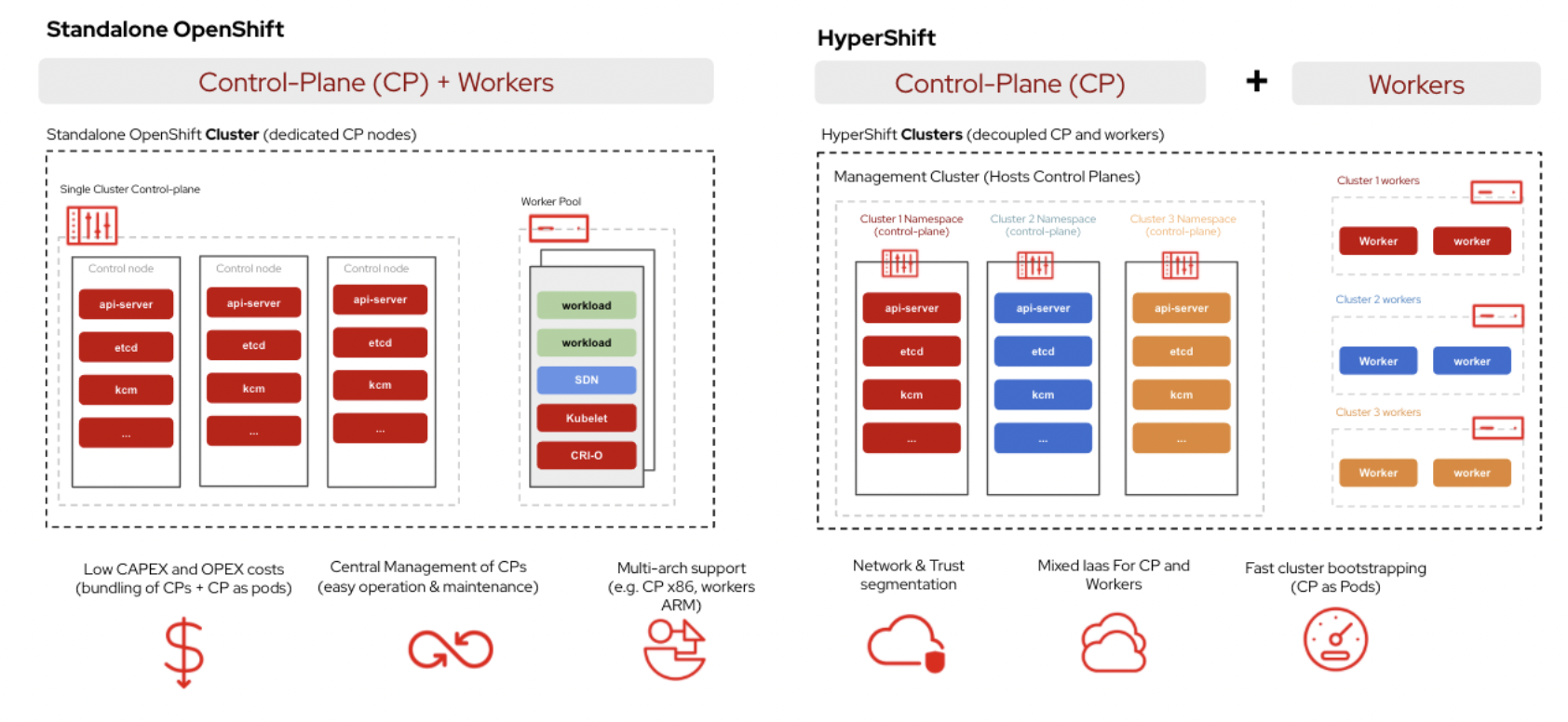Standalone OpenShift (dedicated control plane nodes) vs HyperShift (control planes as pods in a management cluster, workers decoupled).