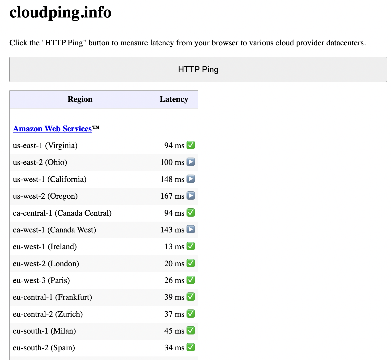 - Click HTTP Ping to measure round-trip time from your browser to AWS (and other cloud) regions.